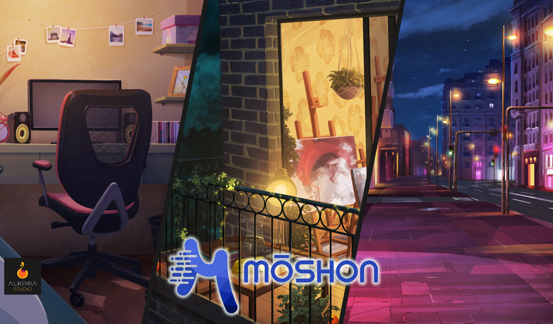 Here are some of the backgrounds I created for Alkimia Animation Studio. They were part of an ad to find VTubers for Moshon TV.
